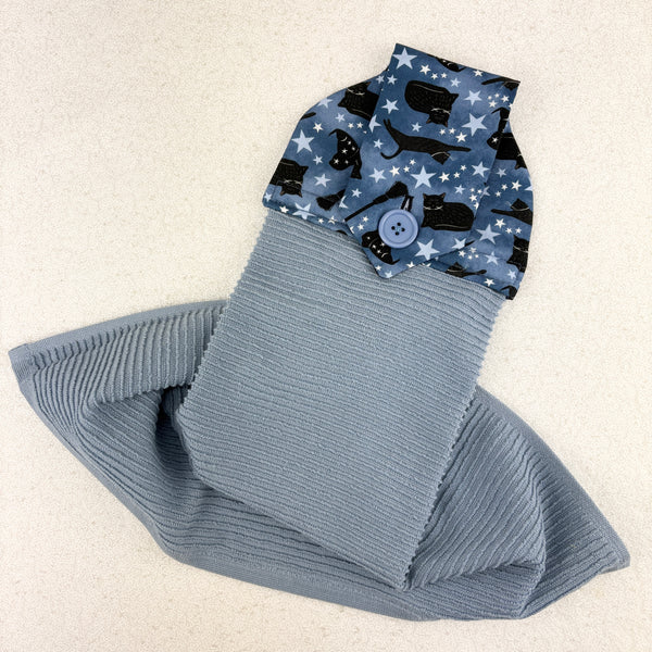 Cotton topped kitchen towel designed to hang from the oven/dishwasher handle or bar style drawer pull.  This towel will do a great job drying your hands with its high quality 100% Turkish cotton terry bottom.  The top is made with 100% cotton fabric and has a piece of cotton flannel in-between the layers to act as a stabilizer.  The item is secured in place with a button (hand stitched on)  instead of velcro.  Velcro can fill with lint and not be as useful, whereas a button will always work (plus buttons are like jewellery for fabric).