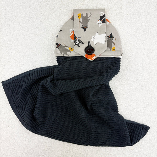 Cotton topped kitchen towel designed to hang from the oven/dishwasher handle or bar style drawer pull.  This towel will do a great job drying your hands with its high quality 100% Turkish cotton terry bottom.  The top is made with 100% cotton fabric and has a piece of cotton flannel in-between the layers to act as a stabilizer.  The item is secured in place with a button (hand stitched on)  instead of velcro.  Velcro can fill with lint and not be as useful, whereas a button will always work (plus buttons are like jewellery for fabric).