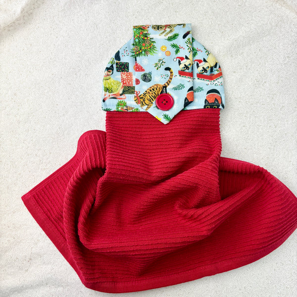Cotton topped kitchen towel designed to hang from the oven/dishwasher handle or bar style drawer pull.  This towel will do a great job drying your hands with its high quality 100% Turkish cotton terry bottom.  The top is made with 100% cotton fabric and has a piece of cotton flannel in-between the layers to act as a stabilizer.  The item is secured in place with a button (hand stitched on)  instead of velcro.  Velcro can fill with lint and not be as useful, whereas a button will always work (plus buttons are like jewellery for fabric).