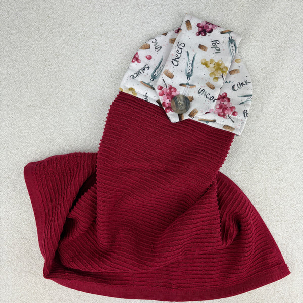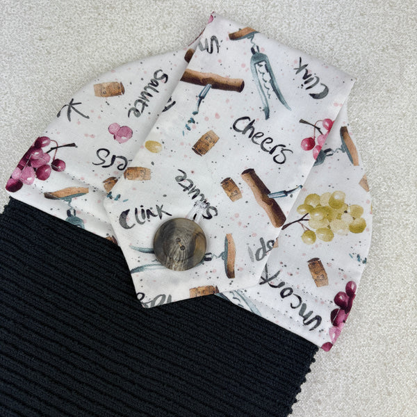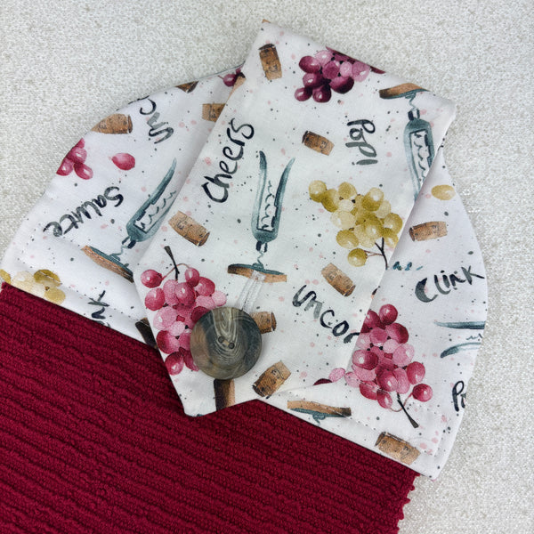 Cotton topped kitchen towel designed to hang from the oven/dishwasher handle or bar style drawer pull.  This towel will do a great job drying your hands with its high quality 100% Turkish cotton terry bottom.  The top is made with 100% cotton fabric and has a piece of cotton flannel in-between the layers to act as a stabilizer.  The item is secured in place with a button (hand stitched on)  instead of velcro.  Velcro can fill with lint and not be as useful, whereas a button will always work (plus buttons are like jewellery for fabric).
