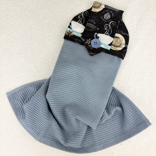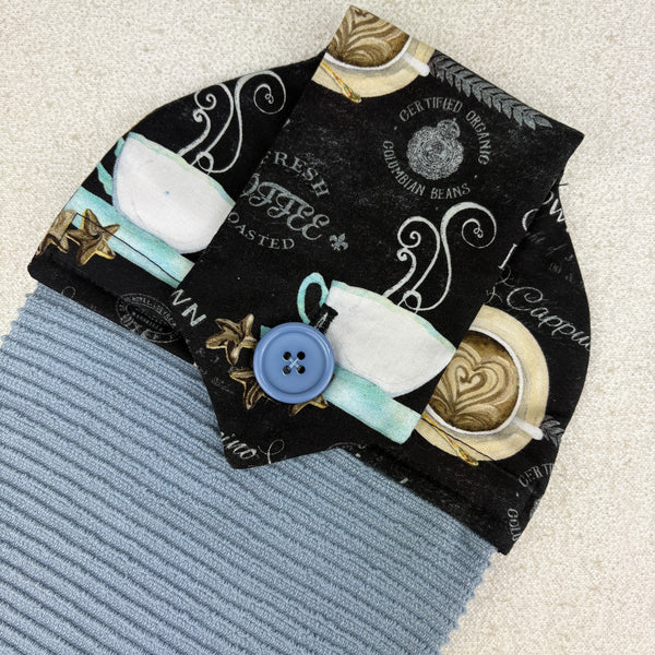Cotton topped kitchen towel designed to hang from the oven/dishwasher handle or bar style drawer pull.  This towel will do a great job drying your hands with its high quality 100% Turkish cotton terry bottom.  The top is made with 100% cotton fabric and has a piece of cotton flannel in-between the layers to act as a stabilizer.  The item is secured in place with a button (hand stitched on)  instead of velcro.  Velcro can fill with lint and not be as useful, whereas a button will always work (plus buttons are like jewellery for fabric).