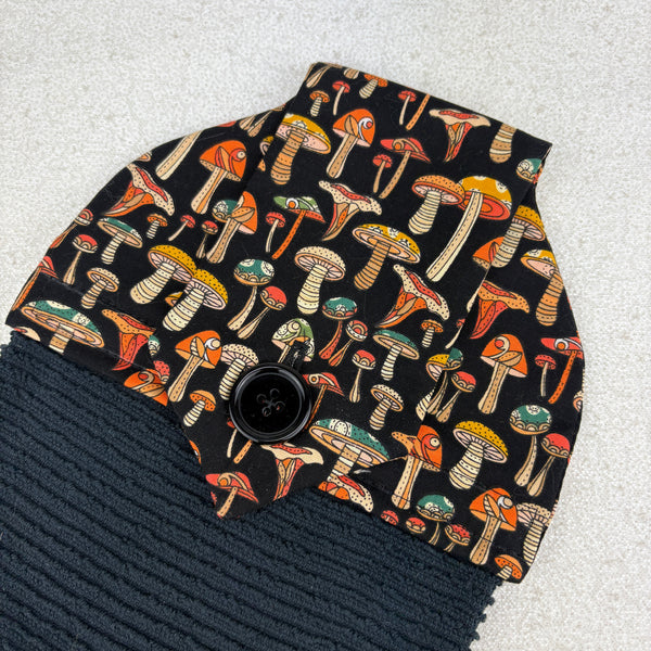 Cotton topped kitchen towel designed to hang from the oven/dishwasher handle or bar style drawer pull.  This towel will do a great job drying your hands with its high quality 100% Turkish cotton terry bottom.  The top is made with 100% cotton fabric and has a piece of cotton flannel in-between the layers to act as a stabilizer.  The item is secured in place with a button (hand stitched on)  instead of velcro.  Velcro can fill with lint and not be as useful, whereas a button will always work (plus buttons are like jewellery for fabric).