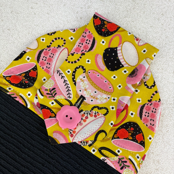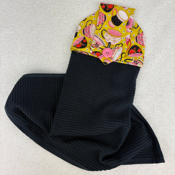 Cotton topped kitchen towel designed to hang from the oven/dishwasher handle or bar style drawer pull.  This towel will do a great job drying your hands with its high quality 100% Turkish cotton terry bottom.  The top is made with 100% cotton fabric and has a piece of cotton flannel in-between the layers to act as a stabilizer.  The item is secured in place with a button (hand stitched on)  instead of velcro.  Velcro can fill with lint and not be as useful, whereas a button will always work (plus buttons are like jewellery for fabric).