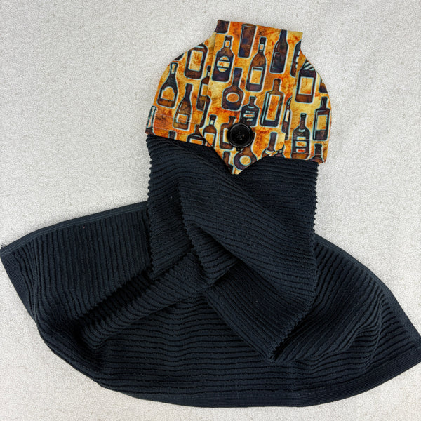 kitchen towel with pattern of vintage whiskey bottles