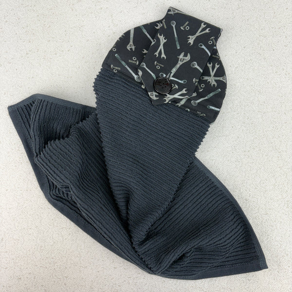 Cotton topped kitchen towel designed to hang from the oven/dishwasher handle or bar style drawer pull.  This towel will do a great job drying your hands with its high quality 100% Turkish cotton terry bottom. The top is made with 100% cotton fabric and has a piece of cotton flannel in-between the layers to act as a stabilizer. The item is secured in place with a button (hand stitched on)  instead of velcro. Velcro can fill with lint and not be as useful, whereas a button will always work (plus buttons are like jewellery for fabric).