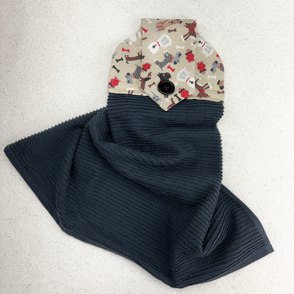Cotton topped kitchen towel designed to hang from the oven/dishwasher handle or bar style drawer pull.  This towel will do a great job drying your hands with its high quality 100% Turkish cotton terry bottom.  The top is made with 100% cotton fabric and has a piece of cotton flannel in-between the layers to act as a stabilizer.  The item is secured in place with a button (hand stitched on)  instead of velcro.  Velcro can fill with lint and not be as useful, whereas a button will always work (plus buttons are like jewellery for fabric).